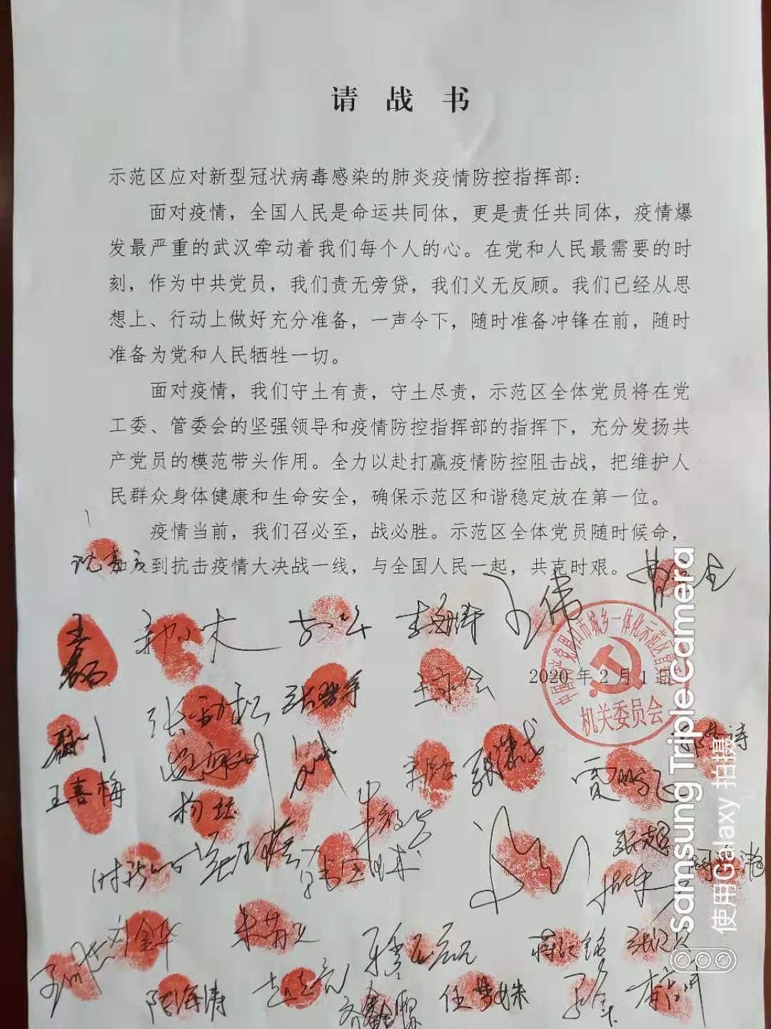 為了能到戰(zhàn)“疫”一線,示范區(qū)廣大黨員干部紛紛簽下“請(qǐng)戰(zhàn)書”,自愿要求加入到抗擊新型冠狀病毒感染的肺炎疫情戰(zhàn)斗中去?!罢?qǐng)戰(zhàn)書”上,他們紛紛按下鮮紅的指印,在指印下面,是每個(gè)黨員堅(jiān)定的簽名,從這些指印和簽名可以看出每個(gè)黨員堅(jiān)定的黨性和為了抗擊疫情大無(wú)畏的英雄氣概。