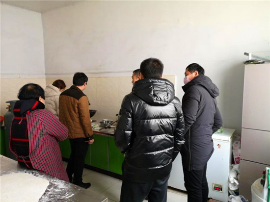 疫情越來越嚴(yán)重,鄉(xiāng)干部全部下沉到行政村,搞宣傳、設(shè)卡點(diǎn)、控人流。因?yàn)樵绯鐾須w無暇在家就餐,加上飯店閉店,鄉(xiāng)政府伙房每餐都就餐人數(shù)從平時一二十人激增到五六十人。買不到饅頭吳素霞就親手蒸,買不到面條她就親手搟。特別是午間各村卡點(diǎn)人員交接時間不一,送走一波人又來一波。剛洗刷完餐具、清掃好廚房又該準(zhǔn)備下一餐了。