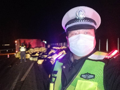 2月15日晚,一輛滿載著蔬菜的大貨車在大廣高速周口轄區(qū)內(nèi)側(cè)翻,一車娃娃菜傾倒在高速路上,占據(jù)了兩個(gè)車道,急需救援。市公安局交通管理支隊(duì)高速二大隊(duì)民警接警后迅速救援,幫助運(yùn)送保障物資的司機(jī)先去送貨,再回來處理事故。
