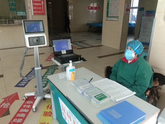 2月18日,記者在周口市中心醫(yī)院急診科看到,一臺醫(yī)用紅外熱像儀出現(xiàn)在急診科的大門口,前來就診的患者必須通過該熱像儀的檢測才能進入急診科就診。“前來就診的患者只需要在熱像儀前經(jīng)過,熱像儀就會在屏幕上自動顯示患者的體溫信息,一旦出現(xiàn)體溫偏高的人,熱像儀就會自動報警,并不需要人工檢測,提高了檢測效率?!痹谠摕嵯駜x前做紀錄的醫(yī)務工作者說。 記者 張洪濤 攝