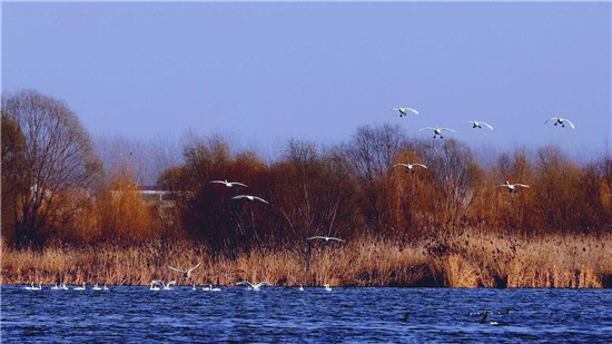 2月21日,50多只白天鵝在國家濕地公園淮陽龍湖自由游弋、展翅翱翔的美麗畫面被記者一一收入鏡頭。記者現(xiàn)場(chǎng)看到,初春的龍湖,天藍(lán)水碧,萬物萌動(dòng)。這群白天鵝的到來,使萬畝龍湖一下子變得靈動(dòng)起來。它們有的在水面上自由覓食,一副悠然自得的神態(tài);有的時(shí)而煽動(dòng)翅膀,抖落長(zhǎng)途跋涉的疲憊;有的飛向藍(lán)天,盡情享受著春日暖陽。為了不打擾這群“客人”,又能拍攝到相對(duì)清晰的圖片,記者環(huán)繞龍湖多處踩點(diǎn),用200mm鏡頭+2倍增距鏡,蹲守一天,最終在畫卦臺(tái)前湖岸向東南方向遠(yuǎn)距離拍攝到了這些美麗的畫面。