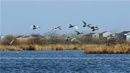 據(jù)在淮陽龍湖北岸疫情卡點(diǎn)值守的安保人員王寶峰介紹,除了這一批50多只白天鵝來龍湖歇腳外,幾天前的2月18日,還有100多只白天鵝在太昊陵前廣場(chǎng)上空盤旋一圈后飛到了龍湖,在龍湖停留一天后向北方遷徙了。