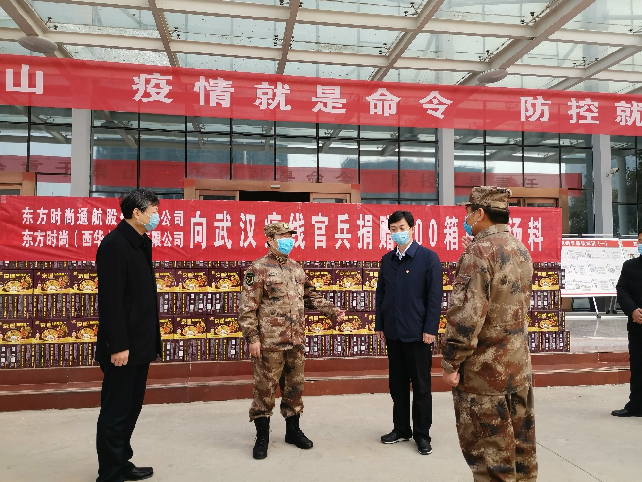 在西華縣人武部院內(nèi),東方時尚通航股份有限公司向武漢疫線官兵捐獻500件胡辣湯料,表達了企業(yè)對人民子弟兵的深情厚誼。王善沖代表部隊對企業(yè)慰問表示感謝。隨后,王善沖一行人又來到該縣大富城小區(qū),對堅守一線的工作人員表示慰問,鼓勵他們在疫情防控的關(guān)鍵時刻要繼續(xù)堅持、不能有放松麻痹思想。