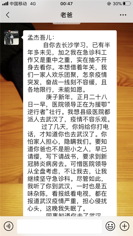 作為父親,我為你擔心;身為一名醫(yī)院的老兵,我為你驕傲;我服務家鄉(xiāng),你支援前線。孟杰吾兒,子承父業(yè),我是醫(yī)生,你為護士;疫情重于泰山,你沒有退縮,我很欣慰,即使你第一時間告訴我,我也會全力支持你的。