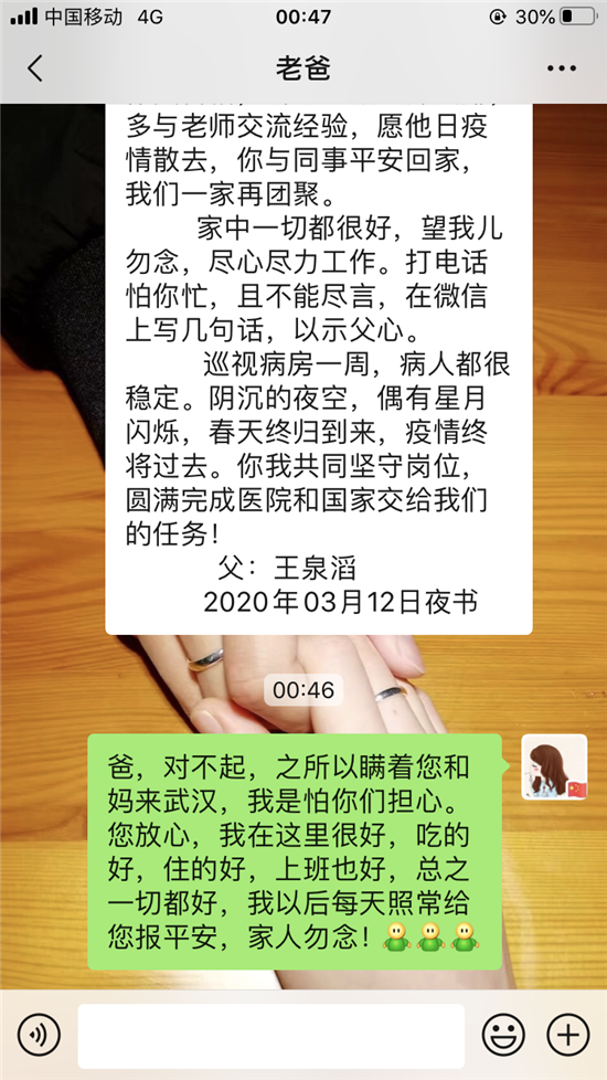 3月21日,周口援鄂醫(yī)療隊出征滿一月。當晚,王泉滔通過微信又鄭重給女兒說下這番話:一晃你在武漢一個月了,我和家人從你去武漢的擔心到現在的放心,這是國家給予我們的安心。農民把地種好,教師把學教好,士兵把國門守好,醫(yī)護把病治好,都是自己的使命,更是自己的初心。人人懷揣私字,社會必敗,遭殃的終歸眾人;眾人心懷天下,萬物皆勝,受益的定是人人。看到河南部分援鄂醫(yī)療隊從武漢凱旋歸來,雖然沒有你的身影,但是我們很高興,說明武漢的疫情已得到控制,我和家人一起期盼你早日歸來。但是還是要再次叮囑你,不要因為疫情到了最后而放松警惕,上下班路上注意安全,穿脫防護服不能有一絲懈怠,時刻保持警醒。年前你當了姑姑,雖然還沒有見到你侄子,但他和家人共同期待你平安回來。吾兒加油!