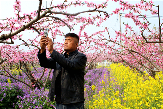 “老鐵們,今年桃花節(jié),因受疫情影響,是網上舉辦的,喜歡看黃橋桃花的網友,不要遺憾,我是您的忠實老鐵,每天會準時給您分享桃花節(jié)的美景圖片及視頻,讓您足不出戶觀賞到萬畝桃園桃花盛開的美景?!?月22日,在西華縣潁河灣生態(tài)采摘園,網紅“西華桃子哥”和合盛正在拍攝桃園美景,一邊通過抖音、快手、微信群向網友拍攝上傳桃花盛開的視頻、圖片等美景,一邊樂此不疲地口中念念有詞道。