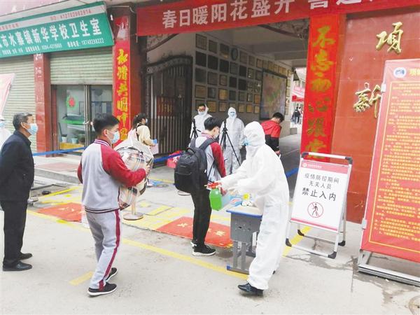 4月20日6時(shí)50分,記者在周口四中門口看到,學(xué)生們?cè)诩议L(zhǎng)的陪伴下陸續(xù)趕來(lái),按照學(xué)校提前下發(fā)的入校流程,在校門口間隔一米距離有序排隊(duì)。然后,他們按規(guī)定依次遞交健康承諾表后,在值班教師的引導(dǎo)下,通過(guò)大門兩側(cè)設(shè)置的體溫測(cè)試通道入校,每個(gè)通道處都有工作人員負(fù)責(zé)引導(dǎo)學(xué)生、噴灑消毒液。