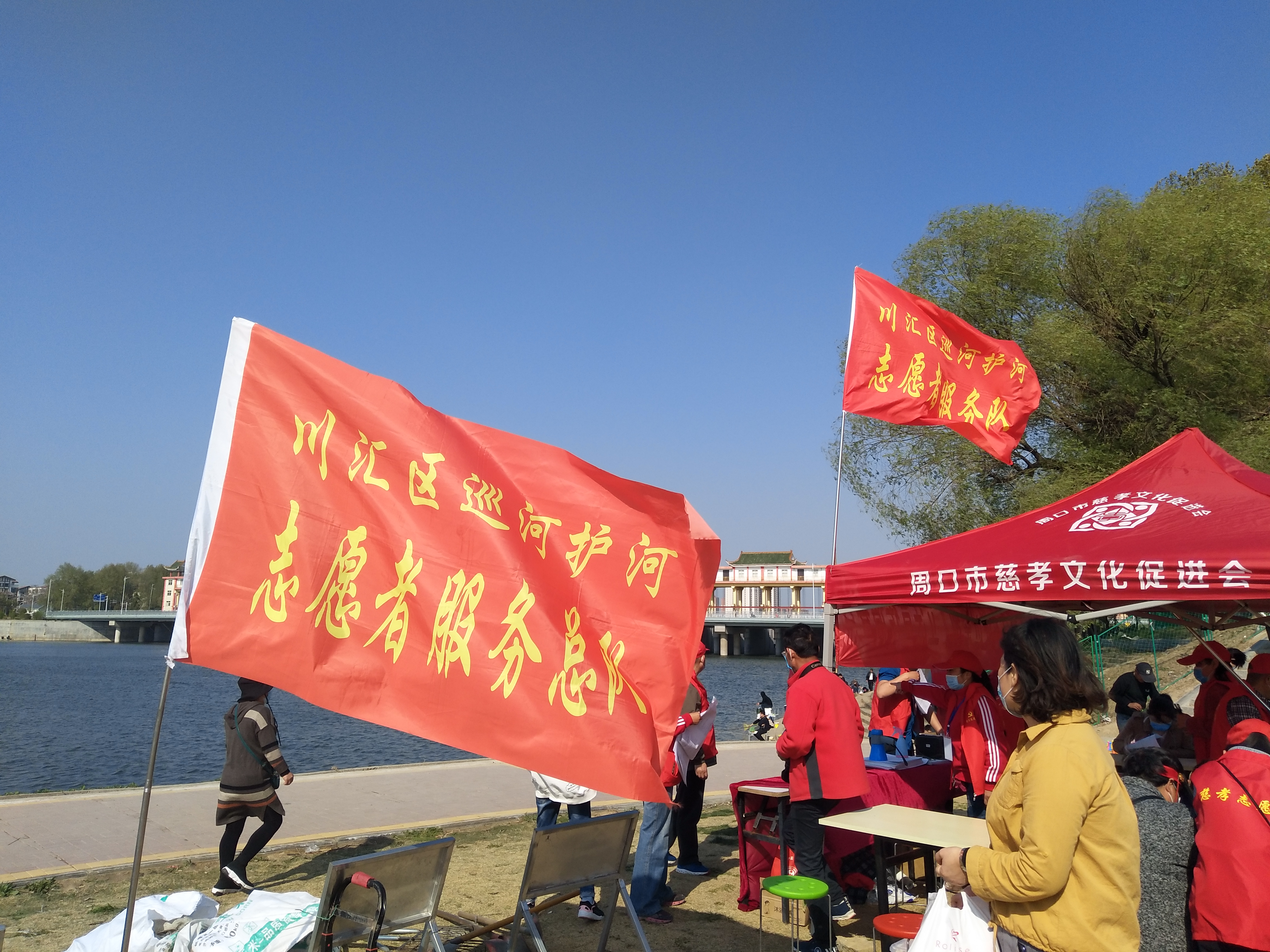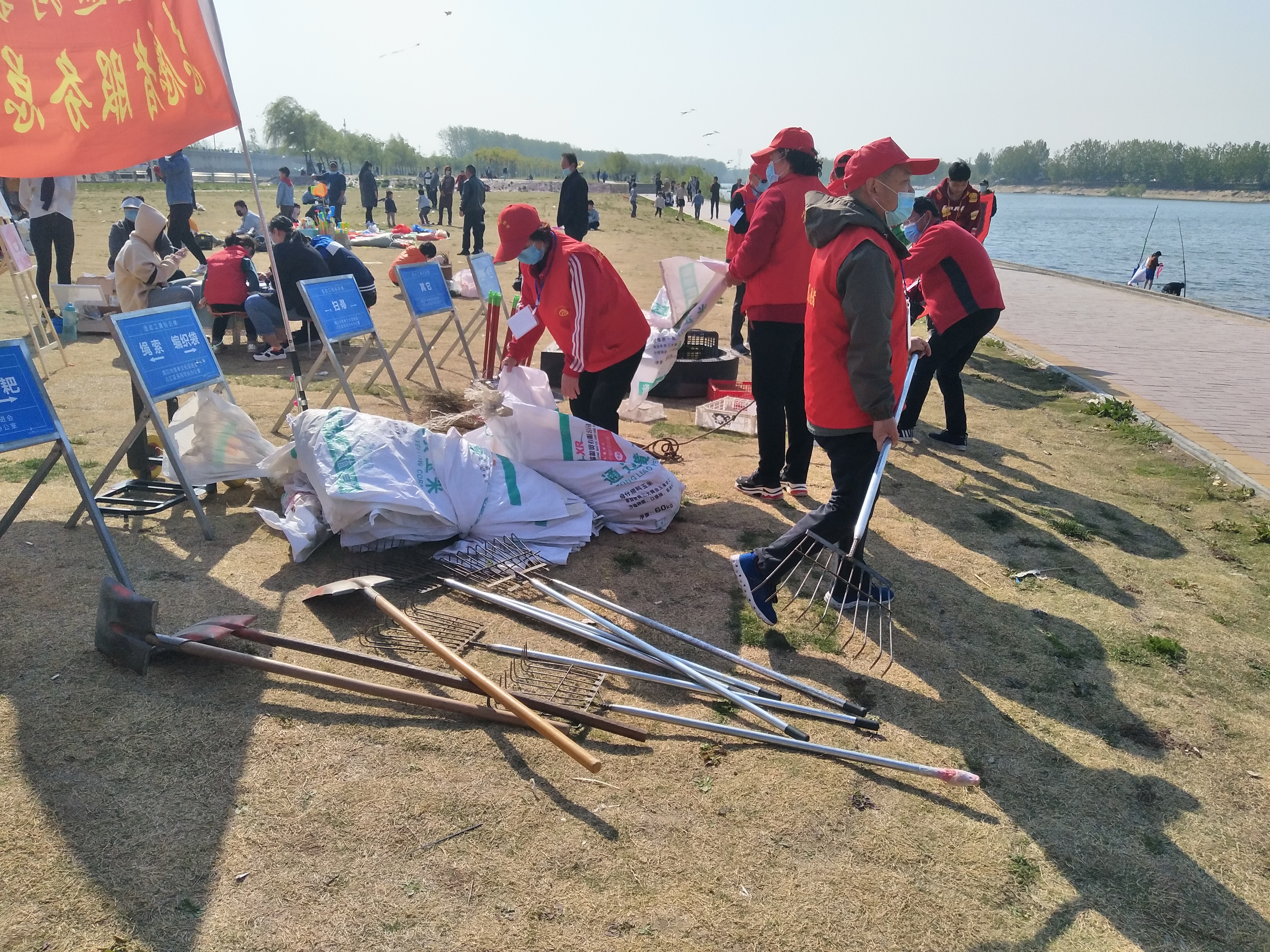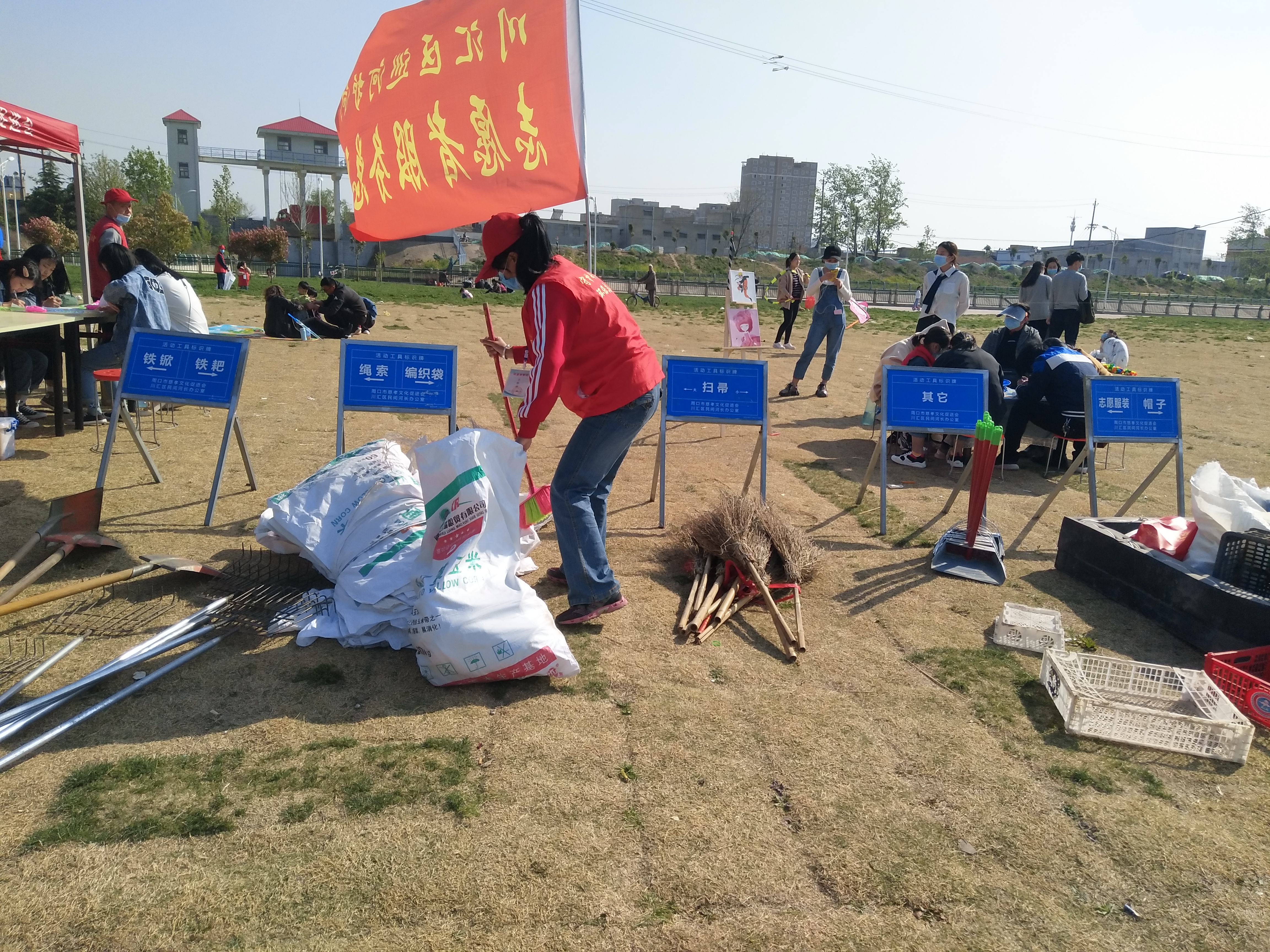 問卷棚旁是擺放整齊的河面垃圾清理工具,鐵锨、鐵耙、繩索、編織袋、掃帚、垃圾箱一字排開,寫有“川匯區(qū)巡河護(hù)河”、“志愿者服務(wù)總隊(duì)”字樣的紅旗迎風(fēng)飛揚(yáng)。記者向志愿者借了身衣服,和大家一起等著護(hù)河總指揮孫彩云分工。