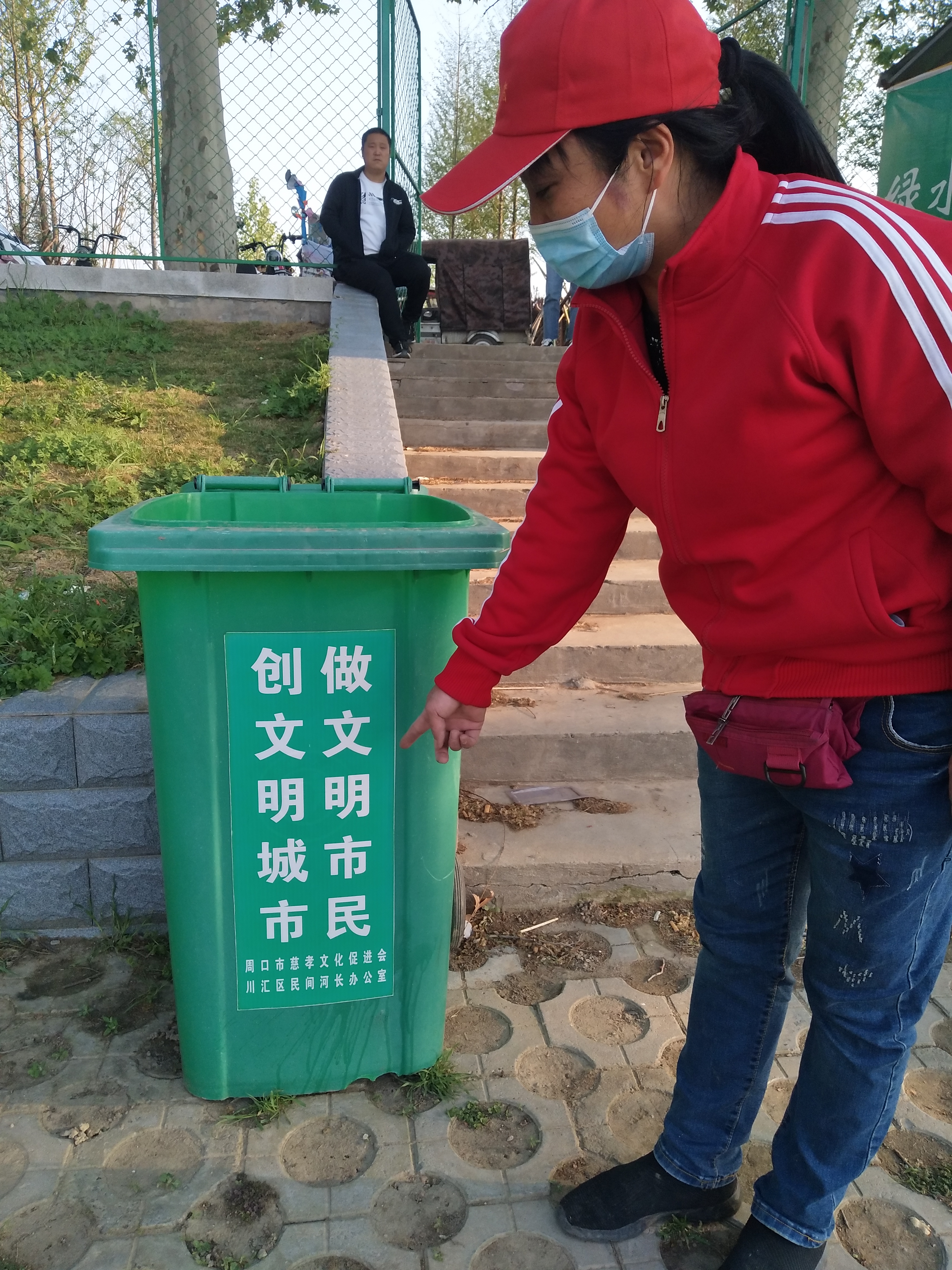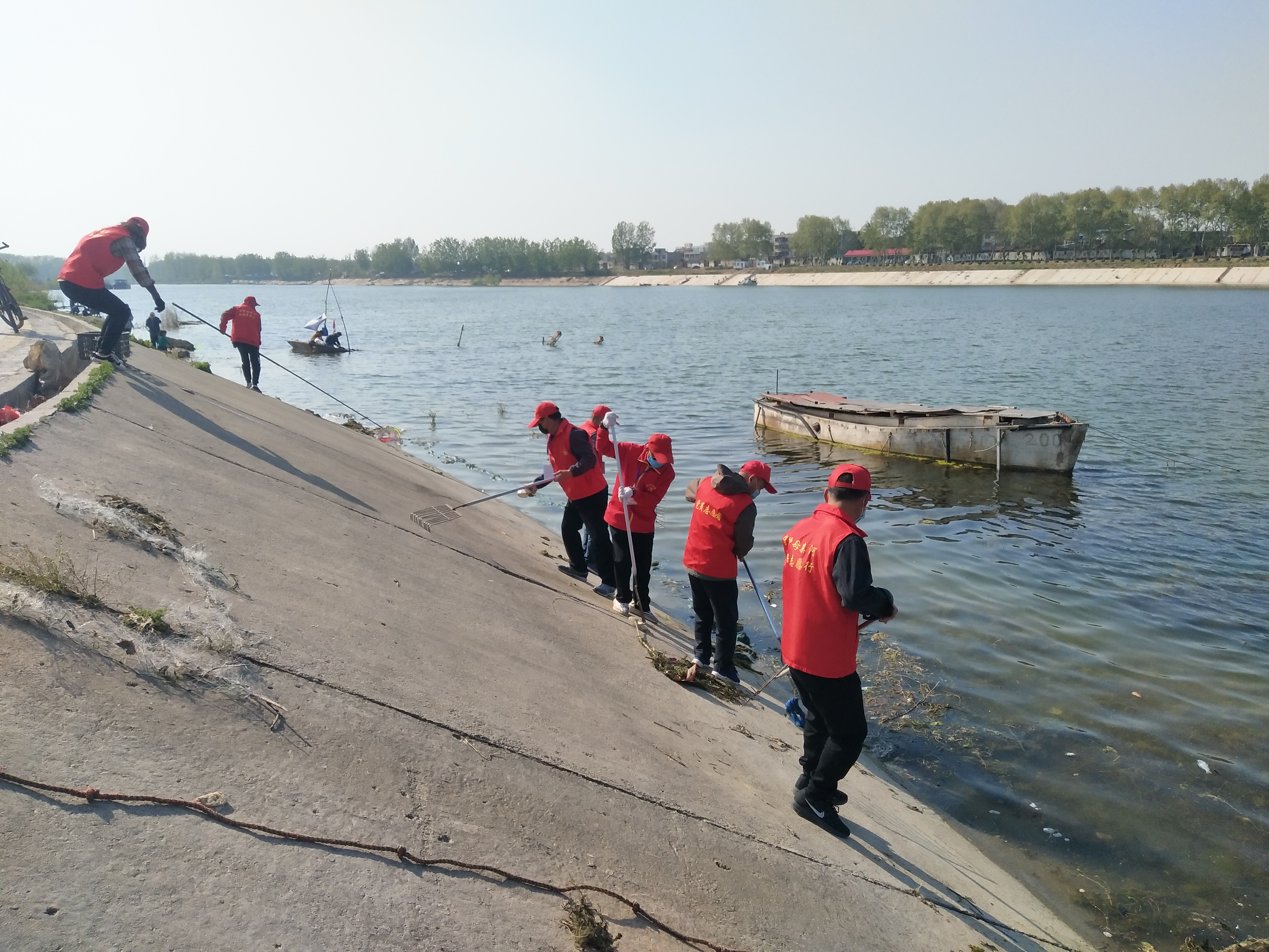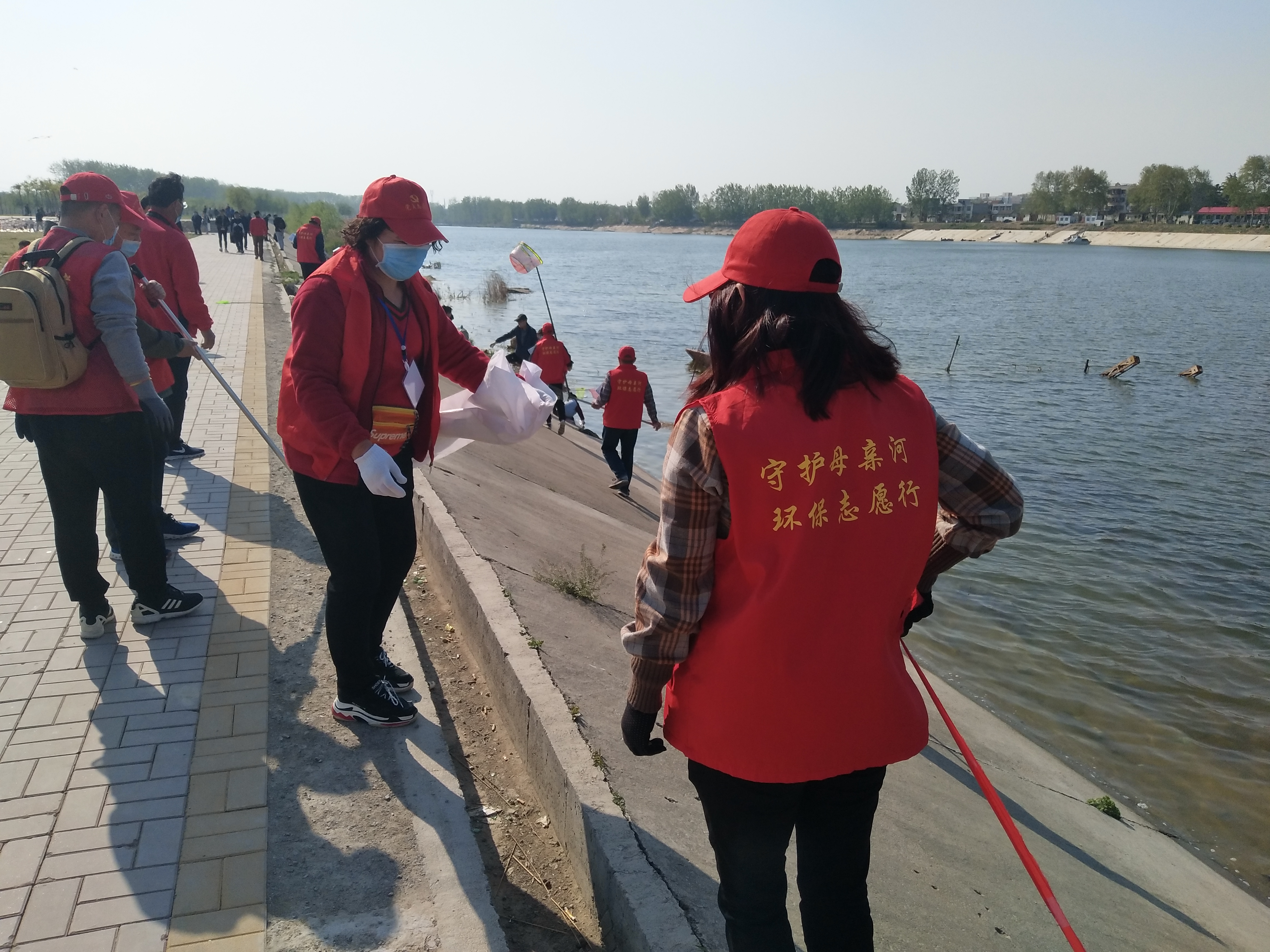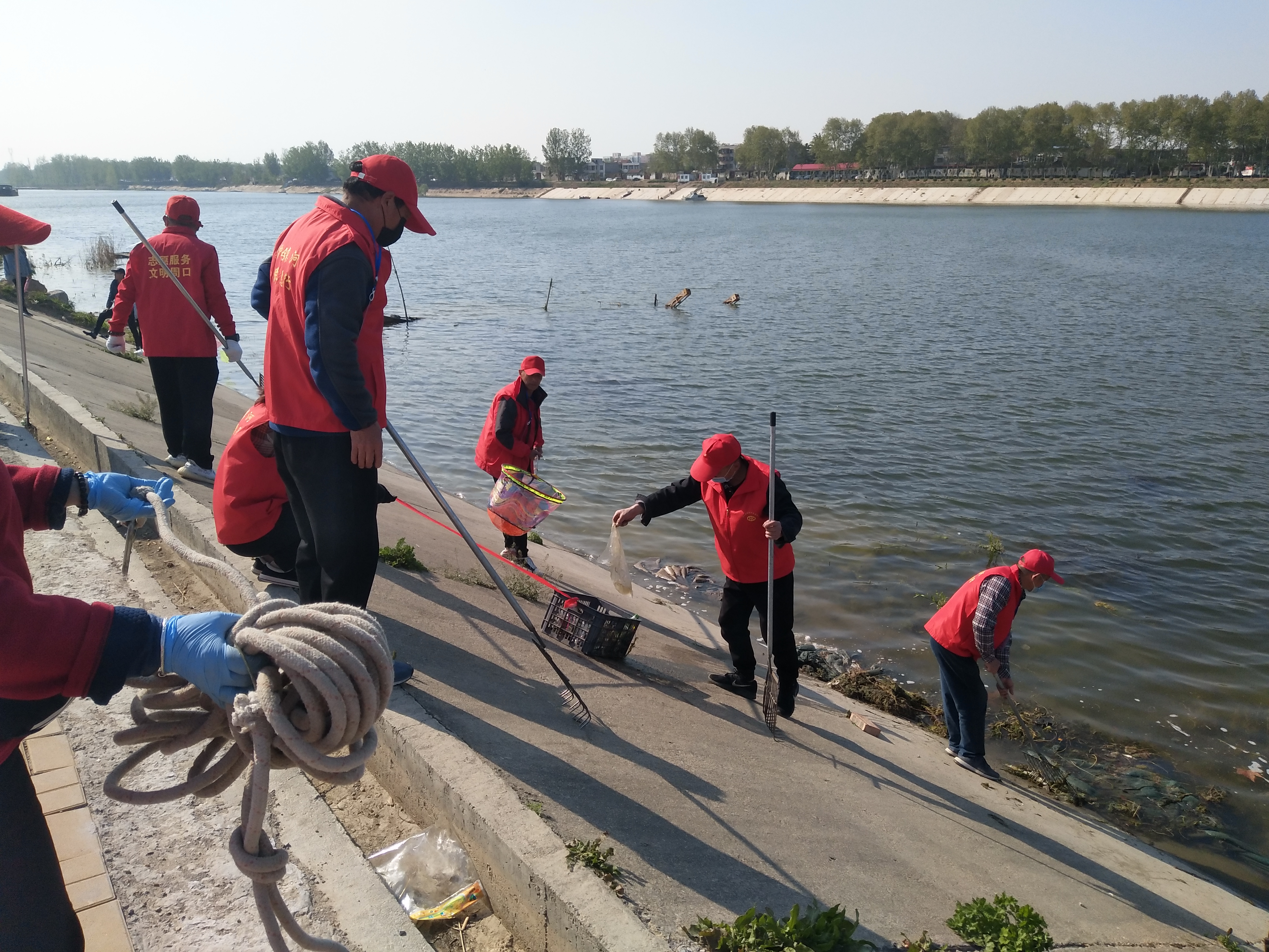 問卷棚旁是擺放整齊的河面垃圾清理工具,鐵锨、鐵耙、繩索、編織袋、掃帚、垃圾箱一字排開,寫有“川匯區(qū)巡河護(hù)河”、“志愿者服務(wù)總隊(duì)”字樣的紅旗迎風(fēng)飛揚(yáng)。記者向志愿者借了身衣服,和大家一起等著護(hù)河總指揮孫彩云分工。