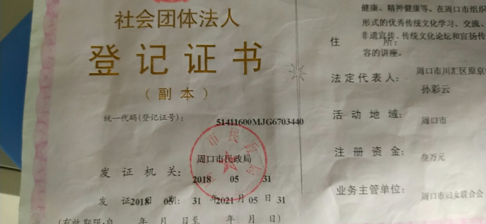 當(dāng)孫彩云把成立志愿者團(tuán)體的想法在微信群里公布后,得到了群友們的積極響應(yīng)??擅耖g志愿團(tuán)體只有熱情是不夠的,憑著不達(dá)目的誓不罷休的性格,孫彩云一家家尋找掛靠單位,功夫不負(fù)有心人,她的毅力感動(dòng)了周口市婦聯(lián)。在市婦聯(lián)的支持下,2017年4月28日,組織定名“周口市慈孝文化促進(jìn)會(huì)”,同年5月8日,首次護(hù)河行動(dòng)在大鐵牛下舉行,成為守護(hù)母親河的起點(diǎn)。2018年5月31日,周口市民政局批示下發(fā)“社會(huì)團(tuán)體法人登記證書”,慈孝文化促進(jìn)會(huì)正式成為國(guó)家注冊(cè)社會(huì)組織。