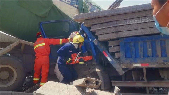 據(jù)了解,由于兩車相撞產(chǎn)生的沖擊力導致貨車與水泥灌車的車體緊緊連在一起,貨車駕駛員被卡在駕駛位上無法動彈。為了能盡快將被困司機救出來,現(xiàn)場指揮員指揮救援人員協(xié)助現(xiàn)場交警、路政部門立即對事故路段進行封鎖處理,并設(shè)置安全員對過往車輛進行警示,保證救援工作正常開展。同時,另一組救援人員首先對壓住駕駛室的石板進行清理,然后使用液壓器材工具組進行破拆,并對駕駛員腿部被擠壓部位進行擴張。經(jīng)過十五分鐘的緊急救援,被困司機被成功救出后移交現(xiàn)場救護車送往醫(yī)院治療。