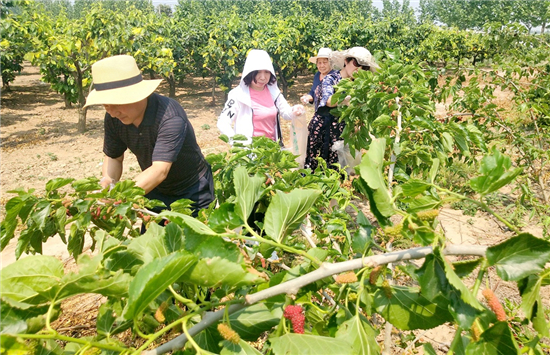 眼下正是桑葚陸續(xù)成熱的好時(shí)節(jié)。黃泛區(qū)農(nóng)場(chǎng)郭莊村鷹虎寶百畝桑椹園,一排排桑樹(shù)枝頭上,掛滿了或青或紅或紫的桑葚。紫黑桑葚放入口中,輕輕一咬,甜甜酸酸的味道瞬間在口中蔓延開(kāi)來(lái),讓人忍不住想多嘗幾顆。