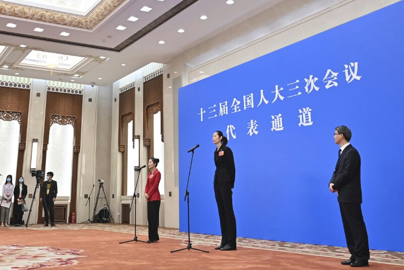 5月22日,第十三屆全國(guó)人民代表大會(huì)第三次會(huì)議舉行首場(chǎng)“代表通道”采訪活動(dòng)。這是全國(guó)人大代表朱婷(右二)通過(guò)網(wǎng)絡(luò)視頻方式接受采訪。新華社記者 劉金海 攝