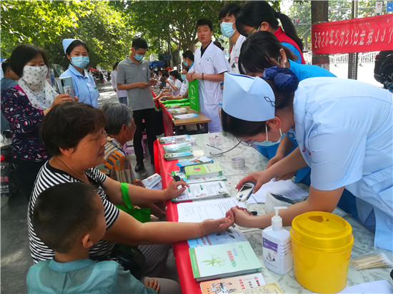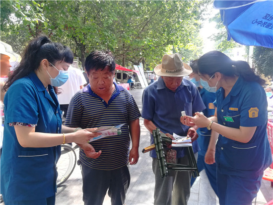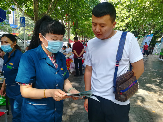 活動現(xiàn)場,參加宣傳活動的各單位工作人員為市民散發(fā)宣傳相關資料,并為市民進行義診。