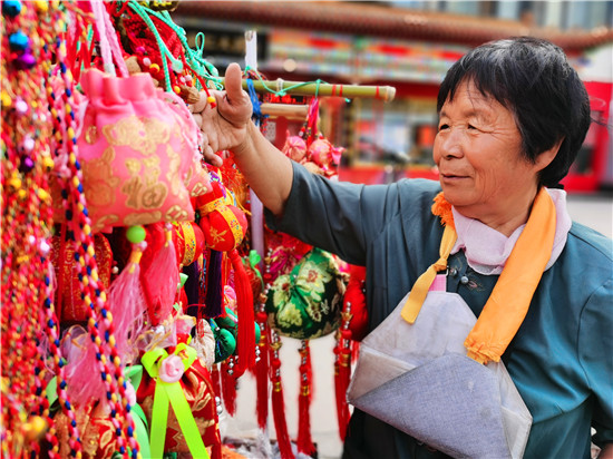 6月4日,呂大媽在懸掛剛做好的香包。端午節(jié)臨近,我市城區(qū)大街小巷,各種形象生動(dòng)、精致可人的香包深受市民喜愛(ài)。