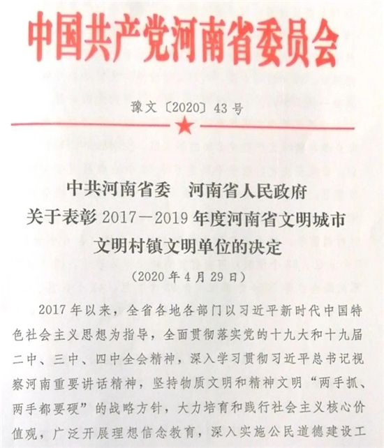 近日,省委、省政府下發(fā)《關于表彰2017—2019年度河南省文明城市文明村鎮(zhèn)文明單位的決定》(豫文〔2020〕43號),鄲城縣婦幼保健院名列其中,榮獲“河南省文明單位”榮譽稱號。這是我院自1987年首次被授予“河南省文明單位”稱號以來,連續(xù)第33年保持這項榮譽。