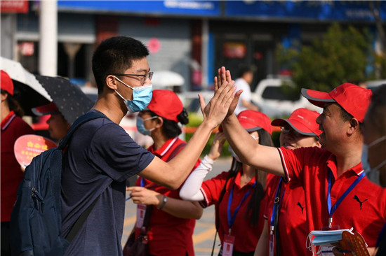 祝愿學(xué)子們考出好成績,今夏實(shí)現(xiàn)金榜題名,是全社會(huì)共同的心聲。7月7日上午8點(diǎn)多,2020年高考開啟神圣時(shí)刻,和往年不同的是,因疫情影響,學(xué)子們帶著口罩入場(chǎng),作為外援的家長們,更是悉數(shù)趕到考場(chǎng)外,為孩子們加油!而辛勤一年的老師們,更顧不上歇一會(huì)兒,也趕到考場(chǎng)外,為學(xué)生擊掌打氣,構(gòu)成周口考場(chǎng)外動(dòng)人的圖景。圖為市一高考場(chǎng)外的家長們舉著加油的牌子,為孩子助威!一高的老師穿上小紅馬甲,當(dāng)志愿者,和進(jìn)場(chǎng)的學(xué)生擊掌助威!