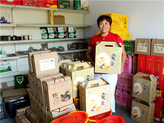 幾年前,孔粉蓮曾干過建材生意,賣過油漆、涂料等,但最讓她得心應手的還是經(jīng)營當?shù)氐霓r(nóng)特產(chǎn)品。她在村里開了一家小門店,代銷當?shù)氐暮睖?、石磨面、食用菌、紅薯粉條等,顧客贏門,生意很是紅火。