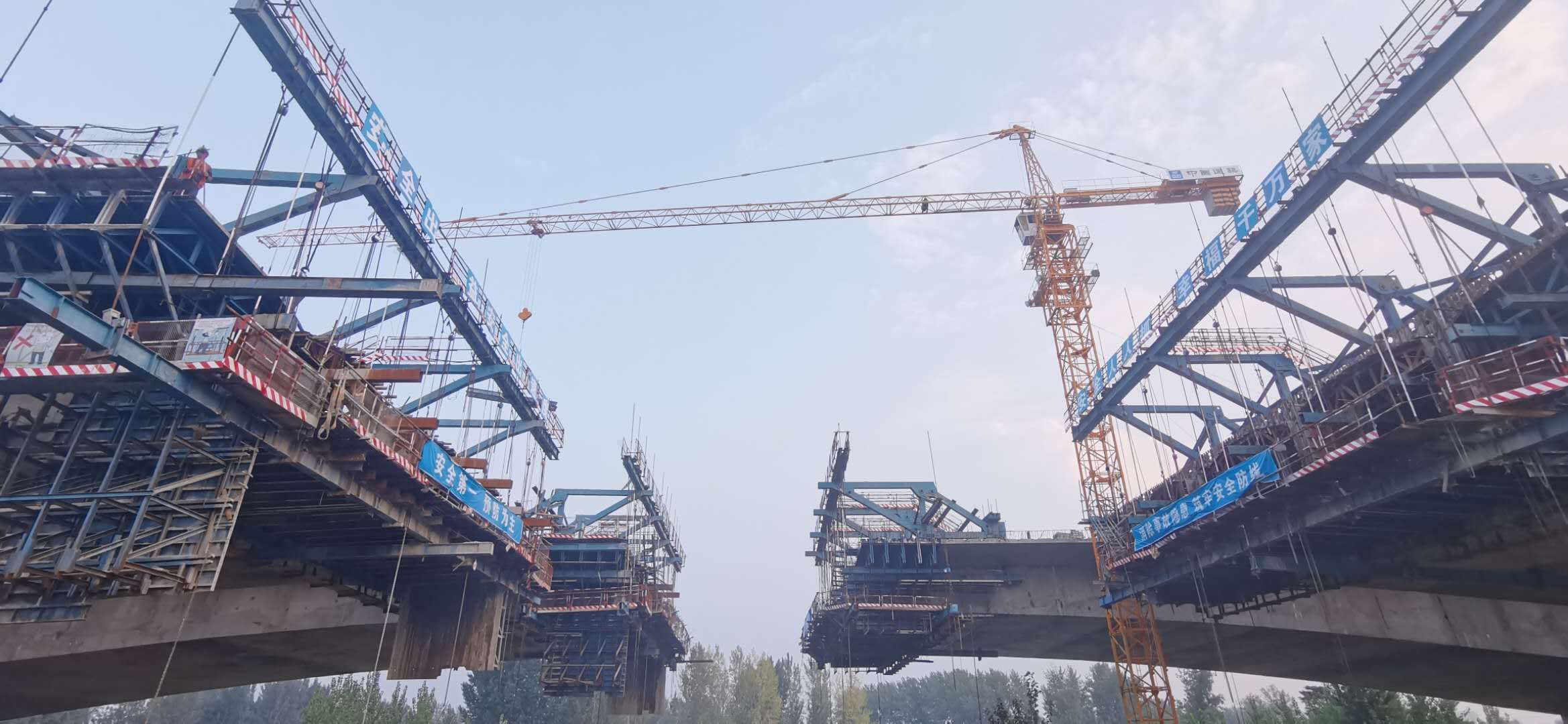 該橋東西兩側(cè)引橋采用40米預(yù)應(yīng)力箱梁,全橋40米預(yù)制箱梁252片,東側(cè)引橋梁板架設(shè)已全部完成正在進(jìn)行橋面系施工,西側(cè)引橋已架設(shè)半幅。主橋采用預(yù)應(yīng)力變截面連續(xù)現(xiàn)澆梁,懸澆段共16個(gè)節(jié)段,采用四套菱形掛籃;左幅已施工至15號(hào)節(jié)段,即將開始合龍段施工;右幅已施工至12號(hào)節(jié)段。