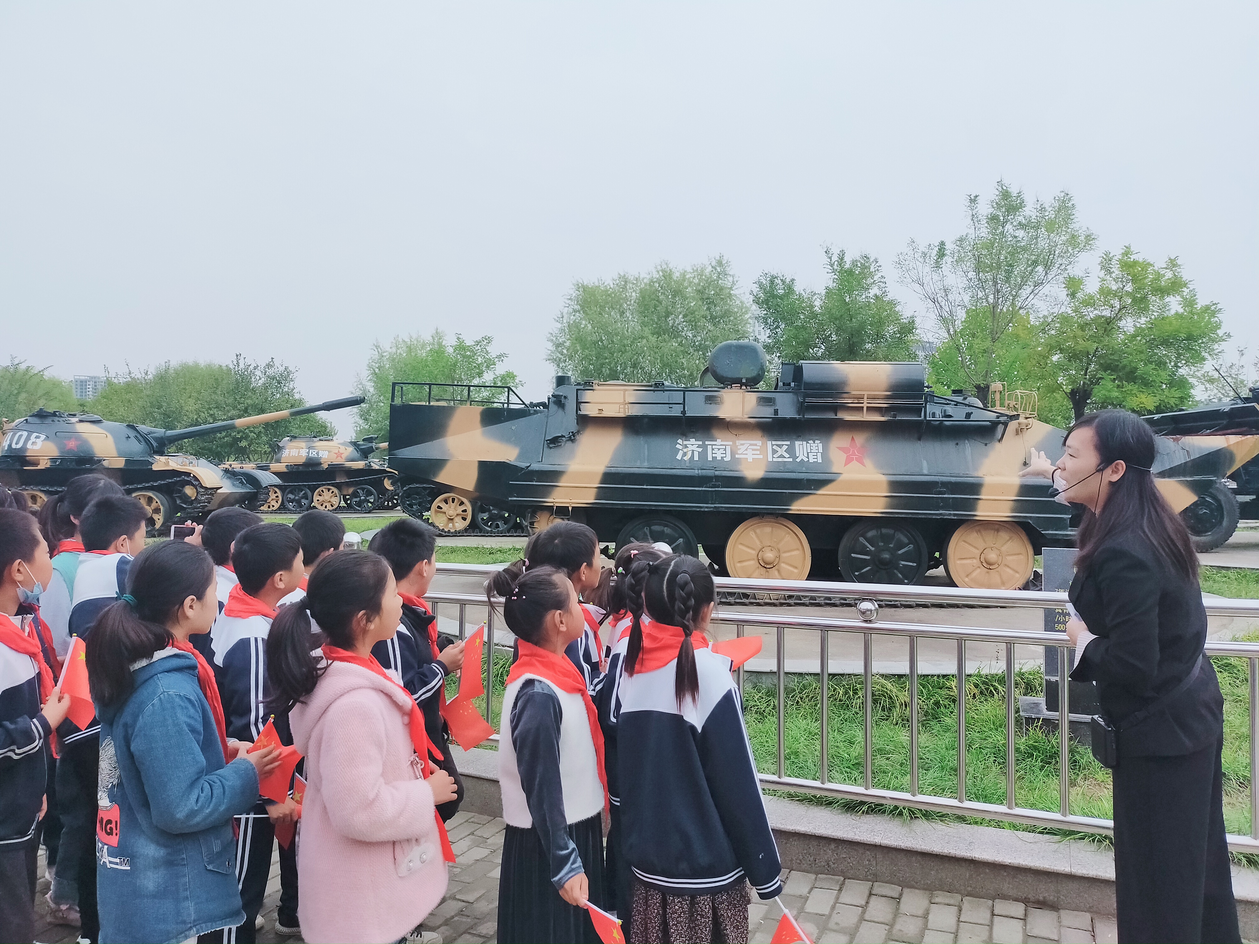 當(dāng)日10時(shí)許,在講解員的帶領(lǐng)下,學(xué)生們?cè)谥芸趪?guó)防園參觀了坦克、火箭炮、榴彈炮、高射炮、飛機(jī)等軍事裝備,增長(zhǎng)了國(guó)防知識(shí),受到了愛國(guó)主義教育。隨后,在主辦方志愿者的帶領(lǐng)下,學(xué)生們?cè)谲娕炁札R唱國(guó)歌共同慶祝祖國(guó)生日。