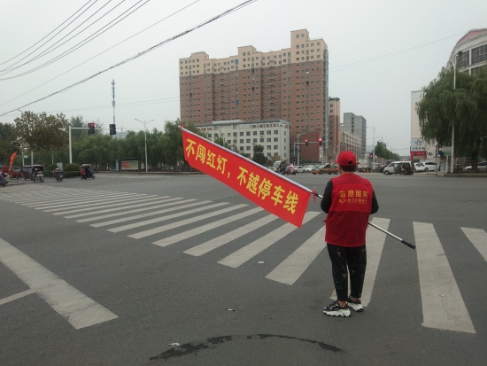 10月12日,記者在周口中心城區(qū)交通大道與建安路交叉口看到,幾名志愿者手中的小紅旗“加長(zhǎng)了”,上面還寫有“不闖紅燈,不越停車線”的溫馨提示語。路過此處,不少市民把目光投在了這個(gè)加長(zhǎng)的小紅旗上,有的還輕聲讀出紅旗上的標(biāo)語。通過這些溫馨提示語,讓市民在潛移默化中逐漸增強(qiáng)文明出行的意識(shí)。記者 張洪濤 攝 ②5