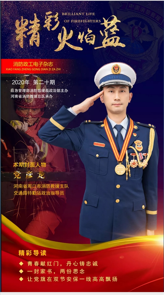 在最近一期《精彩火焰藍(lán)》電子雜志上,封面人物是來自周口消防救援支隊交通路特勤站政治指導(dǎo)員黨彥龍。該電子雜志封面人物主要介紹 “河南省最美消防人”、“河南省人民滿意的政法干警”、河南省“優(yōu)秀人民警察”等優(yōu)秀人物。