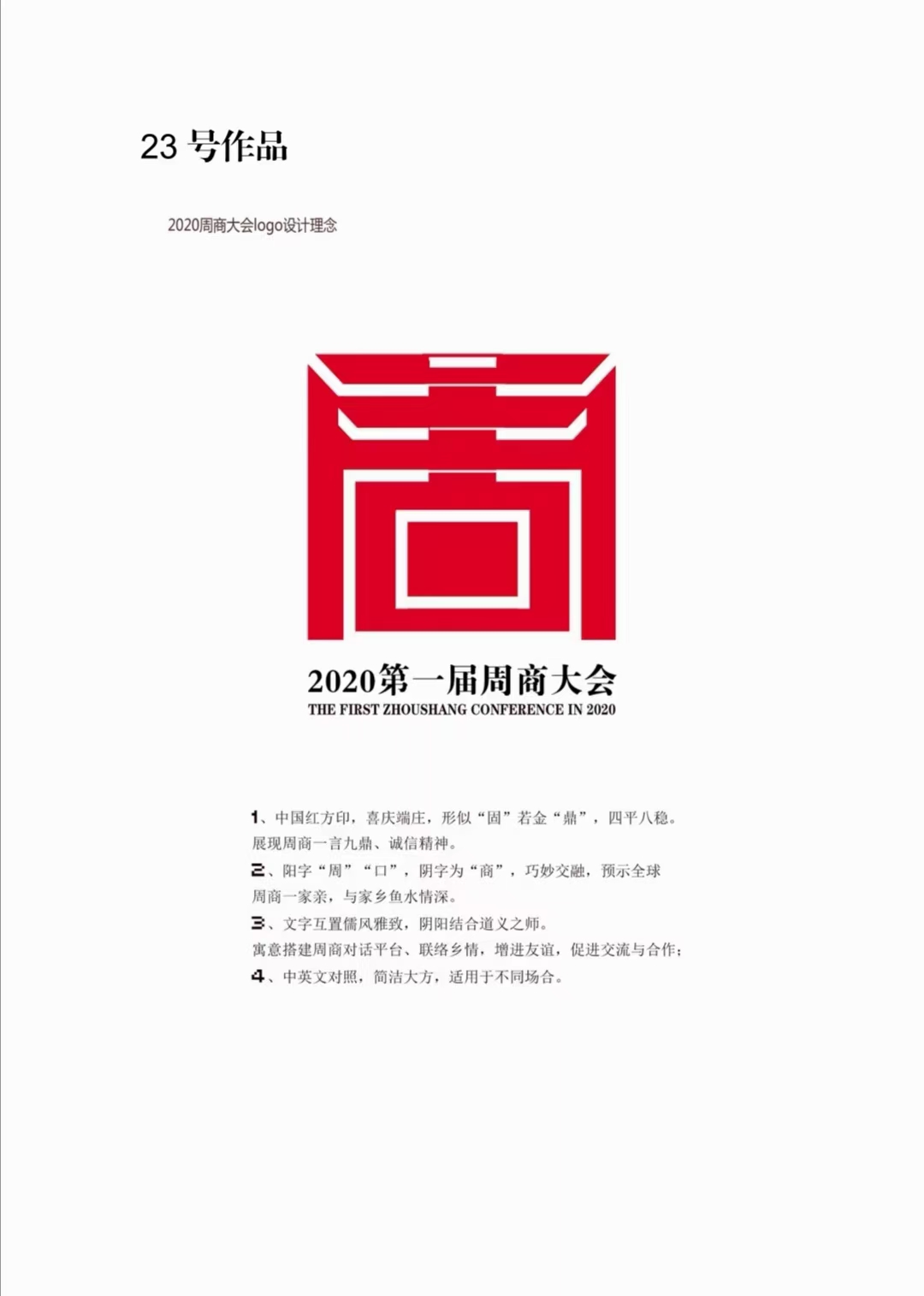 23號(hào)作品設(shè)計(jì)者沈湛向記者介紹了獲獎(jiǎng)作品的設(shè)計(jì)理念。作品采用中國(guó)紅,喜慶端莊,智圓行方,形似“固”若金“鼎”,四平八穩(wěn),展現(xiàn)了周商的志存高遠(yuǎn)、一言九鼎和誠(chéng)信經(jīng)營(yíng)。同時(shí),陽(yáng)字“周”“口”,陰字為“商”,巧妙交融,預(yù)示全球周商一家親,周商和家鄉(xiāng)魚(yú)水情深。再者,文字互置儒風(fēng)雅致,陰陽(yáng)結(jié)合道義之師,寓意搭建周商對(duì)話平臺(tái),聯(lián)絡(luò)鄉(xiāng)情、增進(jìn)友誼,促進(jìn)交流與合作。最后,中英文對(duì)照,簡(jiǎn)潔大方,適用于不同場(chǎng)合。