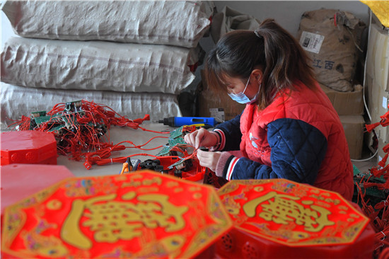 12月14日,記者在一帆工藝制作工廠內(nèi)看到,二十多名村民在各自的工作崗位上有條不紊地忙碌著。簡(jiǎn)易焊接、測(cè)試組裝、安裝炮串……一串串喜慶的電子鞭炮組成裝箱,賀潘海正在指揮工作人員裝車(chē),現(xiàn)場(chǎng)一派繁忙的景象。