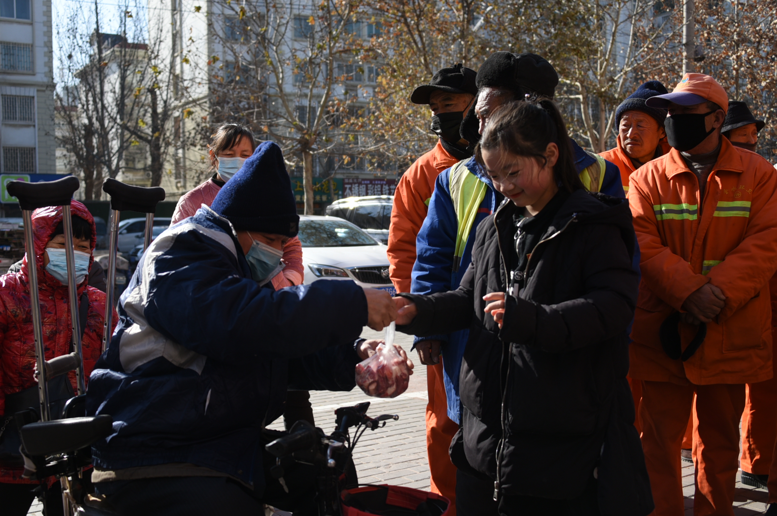 2021年1月1日上午11點(diǎn)許,在鄭州國(guó)基路守味者羊肉館店門口,數(shù)十多名身穿橘紅色的環(huán)衛(wèi)工人,十余多名殘疾人聚集在店門口等待愛(ài)心羊肉的派發(fā)。