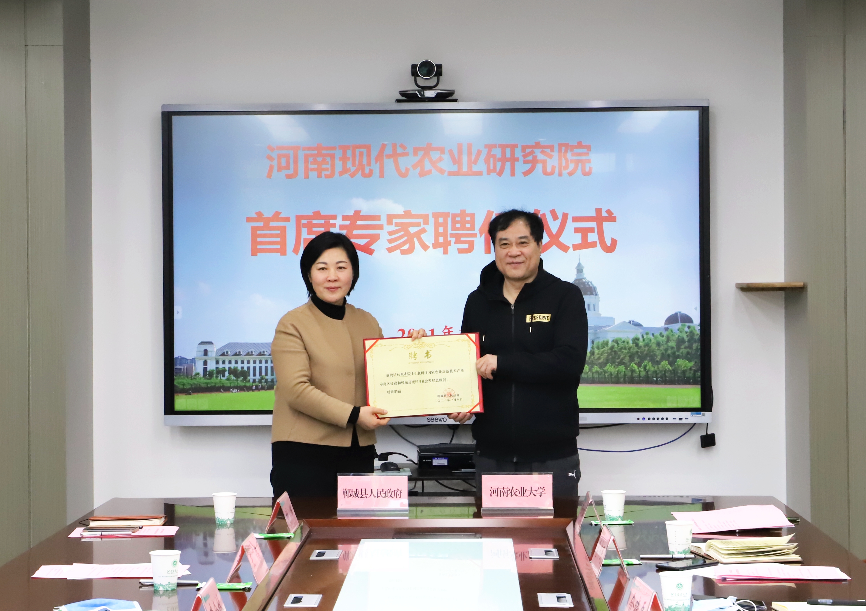 鄲城縣聘請河南農(nóng)業(yè)大學(xué)有關(guān)專家組成“河南現(xiàn)代農(nóng)業(yè)研究院首席專家團(tuán)”。羅文閣向張改平發(fā)放周口國家農(nóng)業(yè)高新技術(shù)產(chǎn)業(yè)示范區(qū)建設(shè)和鄲城縣域經(jīng)濟(jì)社會(huì)發(fā)展總顧問聘書,李全林、介曉磊共同簽署了共建河南現(xiàn)代農(nóng)業(yè)研究院備忘錄,李全林向河南現(xiàn)代農(nóng)業(yè)研究院9位首席專家發(fā)放聘書。