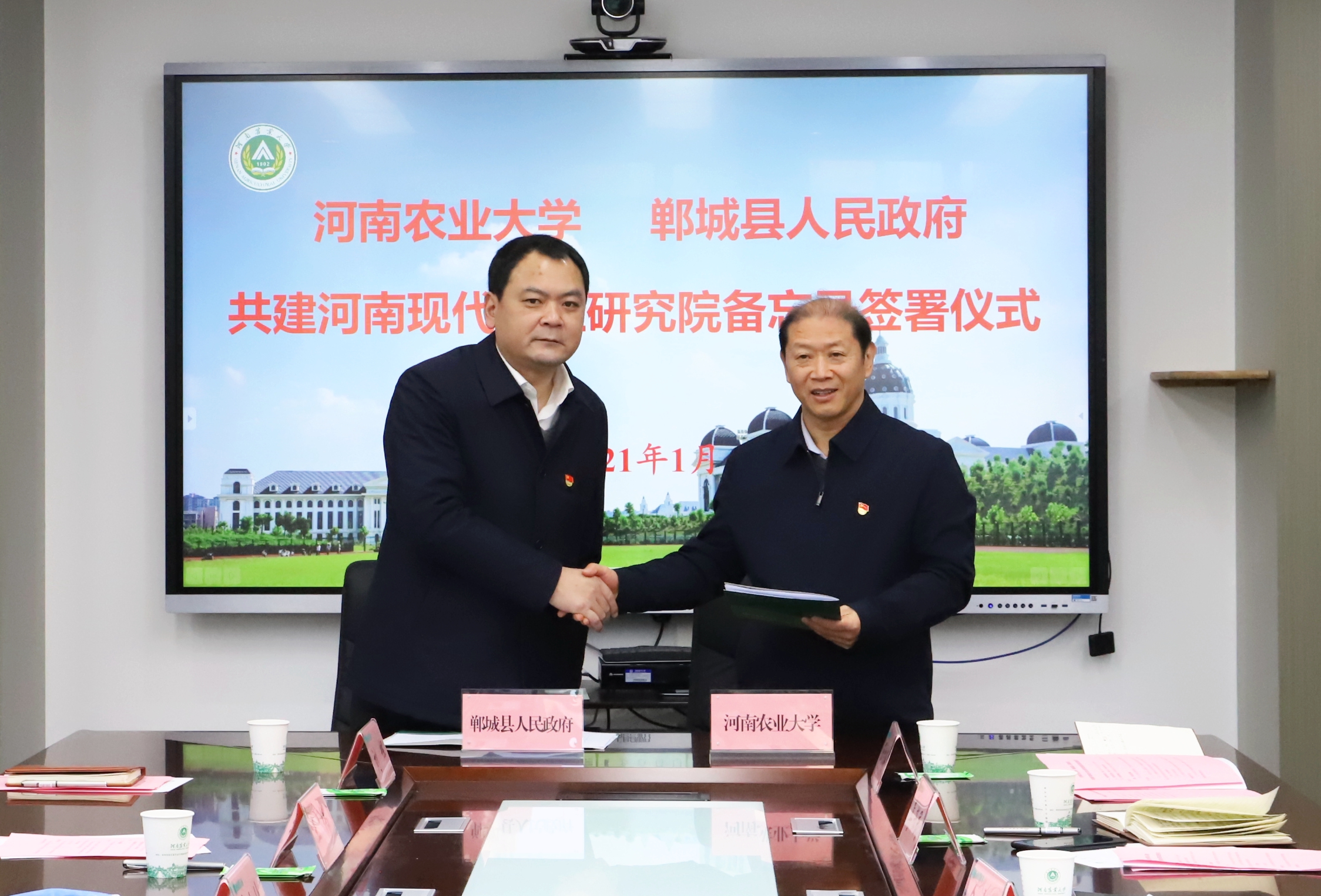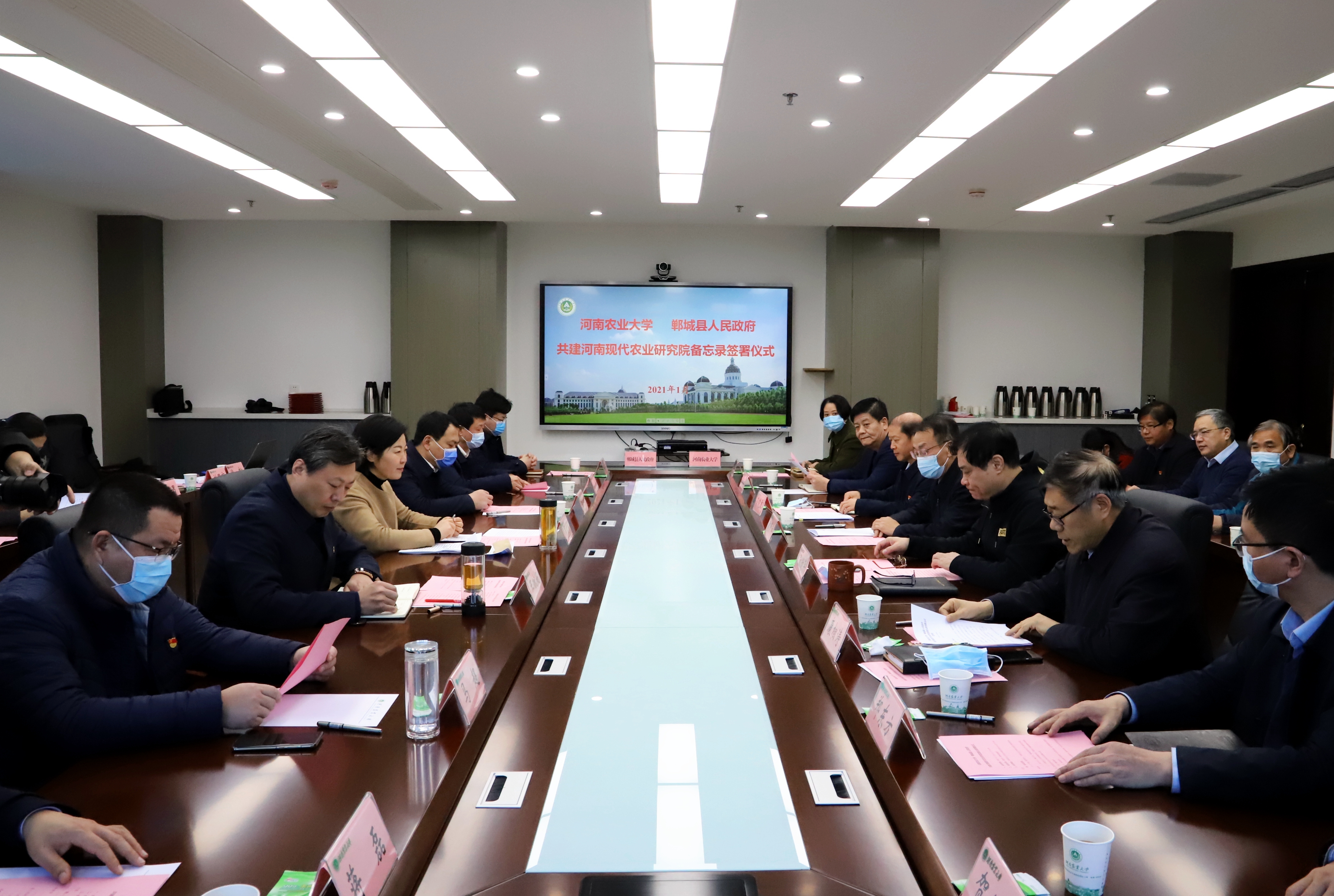 1月8日,鄲城縣人民政府、河南農(nóng)業(yè)大學(xué)共建河南現(xiàn)代農(nóng)業(yè)研究院備忘錄簽署儀式在河南農(nóng)業(yè)大學(xué)龍子湖校區(qū)舉行。河南農(nóng)業(yè)大學(xué)黨委書記魏蒙關(guān),中國工程院院士、校長張改平,校黨委副書記、副校長介曉磊,周口市人大常委會(huì)副主任、鄲城縣委書記羅文閣,縣領(lǐng)導(dǎo)李全林、王獻(xiàn)超、王偉、馬超、劉輝、蔣磊等參加簽約儀式。河南農(nóng)業(yè)大學(xué)副校長康相濤主持簽約儀式。