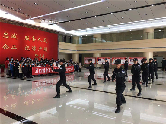 1月10日是首個(gè)“中國(guó)人民警察節(jié)”和“110”誕生35周年。小記者應(yīng)邀提前走進(jìn)市公安局參觀體驗(yàn)。9日上午,在二樓大廳,特警隊(duì)員進(jìn)行了擒敵拳表演,現(xiàn)場(chǎng)掌聲經(jīng)久不息。