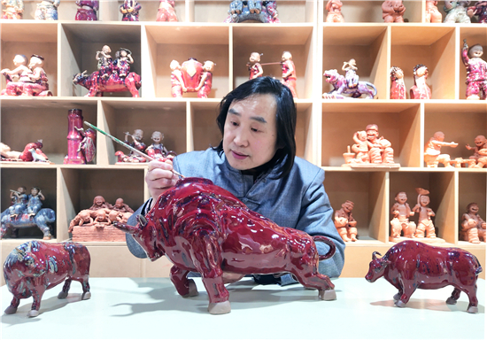 春節(jié)前夕,鄲城泥塑大師張振福歷時多日制作一組鈞瓷泥塑群雕《瑞牛賀新春》。該組作品分為三頭長約90厘米的大牛和若干頭小牛,均為鈞瓷泥塑,采用豫東黃泥和粗獷手法制作,上釉時入窯一色,歷經(jīng)1200多攝氏度高溫?zé)坪蟪龈G萬變,十分精彩。拓荒牛精神,展現(xiàn)中國人自立自強(qiáng)的志氣;孺子牛精神,體現(xiàn)在創(chuàng)造美好生活的時代課題中;老黃牛精神,貴在“心有大我、至誠報國”的奉獻(xiàn)品格。