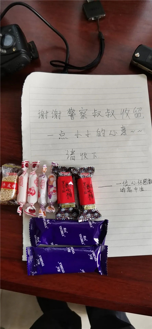 在交警忙于執(zhí)勤時(shí),女孩悄然離去,臨走前留下一封簡短的感謝信和幾顆糖果。