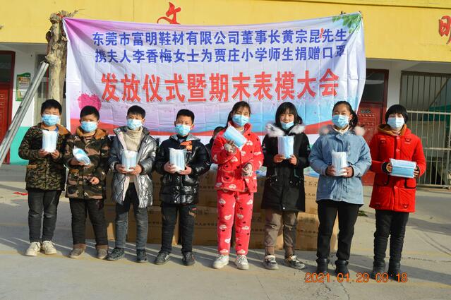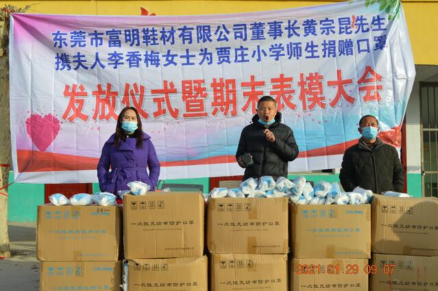 廣東省東莞市富明鞋材有限公司董事長黃宗昆先生及夫人李香梅女士原籍太康縣馬頭鎮(zhèn)薛廟村,他們得知寒假將至,正值師生、家長返鄉(xiāng)團聚、走親訪友高峰時節(jié),當前疫情防控面臨境外疫情持續(xù)爆發(fā)流行、國內(nèi)散發(fā)病例頻發(fā)的新情況、新挑戰(zhàn)。為了確保賈莊小學300多名師生生命安全和身心健康,以及他們近期疫情防控對口罩的需求,進一步增強師生的防控意識,夫妻二人決定為該校捐贈3萬只一次性醫(yī)用口罩,以實際行動助力該校疫情防控工作。