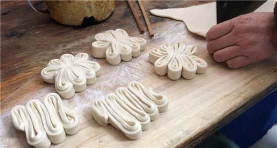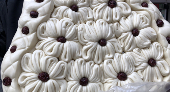 除了平常的白面饅頭,黃師傅還讓妻子現(xiàn)場(chǎng)展示了“棗山”制作,并介紹了棗山的寓意和習(xí)俗。“你看這棗山是一層一層的,寓意著步步登高,而且棗山的花形是圓的,代表著團(tuán)團(tuán)圓圓。過(guò)去出嫁的閨女過(guò)年回娘家要帶大饃,娘家要回棗山,現(xiàn)在咱們周口的一些地方還保留著這樣的習(xí)俗?!眱晌恢鞑ンw驗(yàn)了棗山的制作過(guò)程,得到黃老板妻子的夸獎(jiǎng):“中!這倆妮兒可巧!”