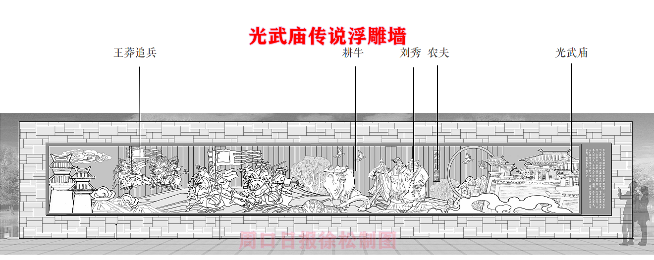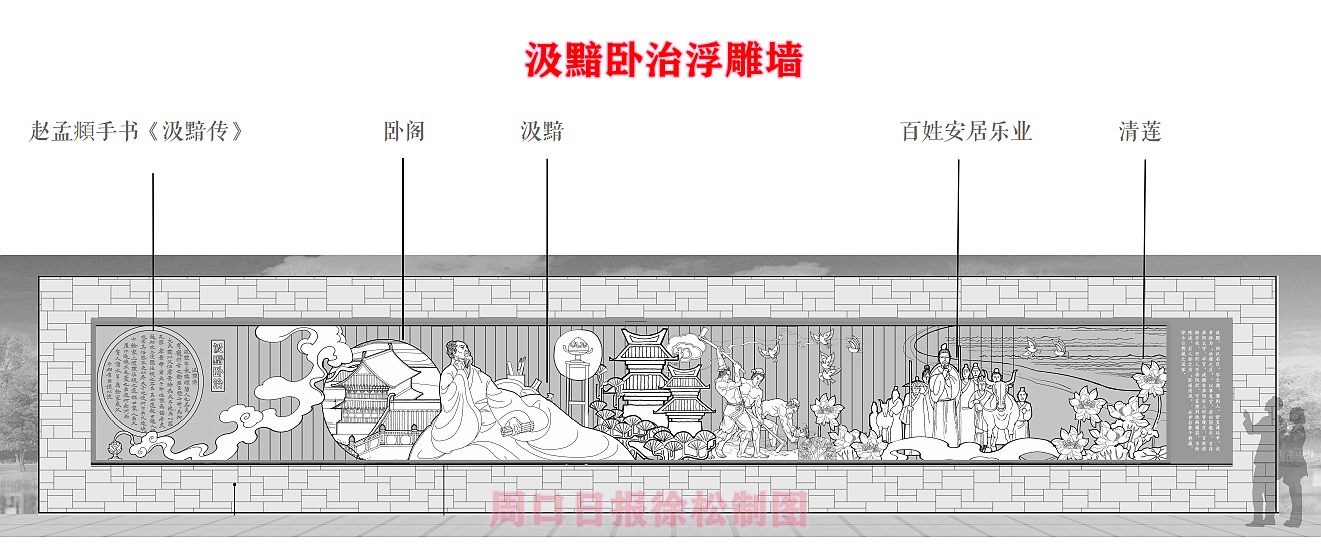 在縣委、縣政府綜合大樓東側(cè)的核心形象段,配合鄲城行政中心打造莊嚴(yán)、大氣氛圍的同時,對鄲城歷史文化進(jìn)行了集中展示,包括鄲城的歷史沿革,鄲城的發(fā)展理念,歷史故事等。其中調(diào)水渠西側(cè)以現(xiàn)有人民廣場對應(yīng)的綠地為基礎(chǔ),設(shè)置了較多的歷史文化節(jié)點(diǎn)。如調(diào)水渠新華路橋頭北側(cè)的廉政文化廣場,講述了漢朝名臣汲黯的故事。汲黯為人耿直,直諫廷諍,親政愛民,敢于承擔(dān)責(zé)任,漢武帝劉徹稱其為“社稷之臣”。汲黯廉政廣場建設(shè)在此處更有著深遠(yuǎn)的意義,它一方面提醒老百姓要了解歷史、敬畏先賢,同時也激勵著鄲城縣的各級黨員干部要在習(xí)近平新時代中國特色社會主義思想引領(lǐng)下,“不忘初心、牢記使命、廉潔奉公、一心為民”。