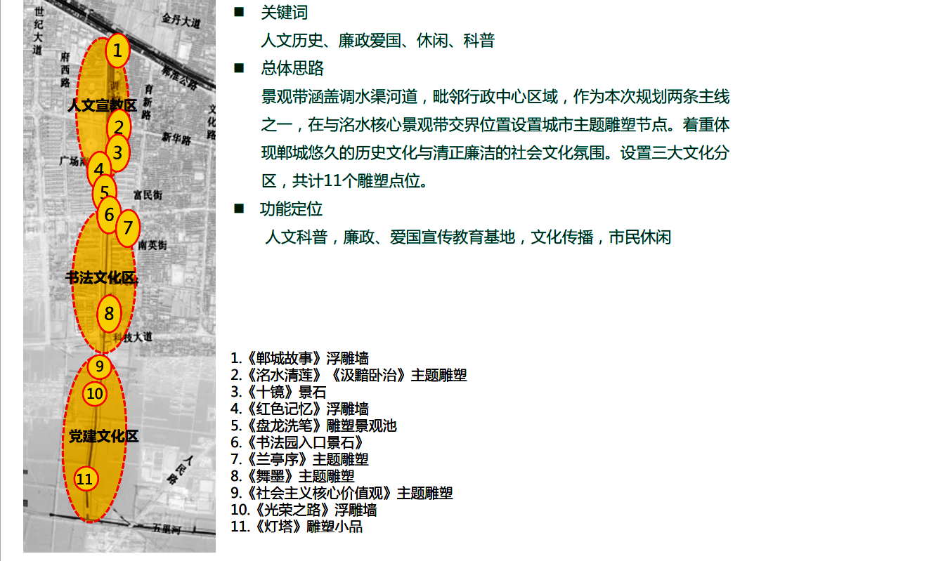 調(diào)水渠景觀在洺河生態(tài)水系“五帶五園一環(huán)多點(diǎn)”景觀中被稱為“人文歷史帶”。全程以“水脈、文脈、人脈”為核心,以“綠色、生態(tài)、休閑、文化”為理念,建設(shè)了“三段銜一園”的景觀結(jié)構(gòu),有鄲淮路至廣場南路的景觀核心形象段、廣場南路以南至科技大道的書法體驗(yàn)段、科技大道以南至五里河的教育文化段和位于交通路與英博路之間的書法生態(tài)休閑園。全段景觀以人文歷史為主題,分別設(shè)置了文化廣場、汲黯廣場、廉政廣場、書林步道、墨香廣場、歷史長廊、書法公園等19處景觀節(jié)點(diǎn)。