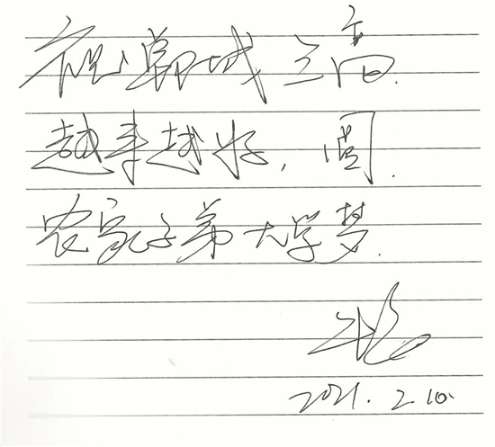 朱婷雖然很少回家,但是一直關(guān)注老家鄲城的發(fā)展變化,特別關(guān)注鄲城的教育發(fā)展,當(dāng)她得知鄲城三高率先提煉出“孝、勤、韌、忠、濟(jì)”為核心的朱婷精神,并把這種精神作為鄲城三高學(xué)子的精神引領(lǐng)時(shí)非常感動(dòng),為鄲城三高始終堅(jiān)持立德樹人的教育理念而高興,為鄲城三高學(xué)子的拼搏進(jìn)取精神而欣慰,為鄲城三高辦學(xué)成果而點(diǎn)贊,并欣然寫下:“ 祝鄲城三高越來越好,圓農(nóng)家子弟大學(xué)夢(mèng);祝鄲城三高學(xué)生前程似錦,學(xué)業(yè)有成。”