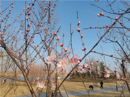 在河堤上,不乏有老年人,走走站站,欣賞春日美景的同時(shí)不忘拍照留念。