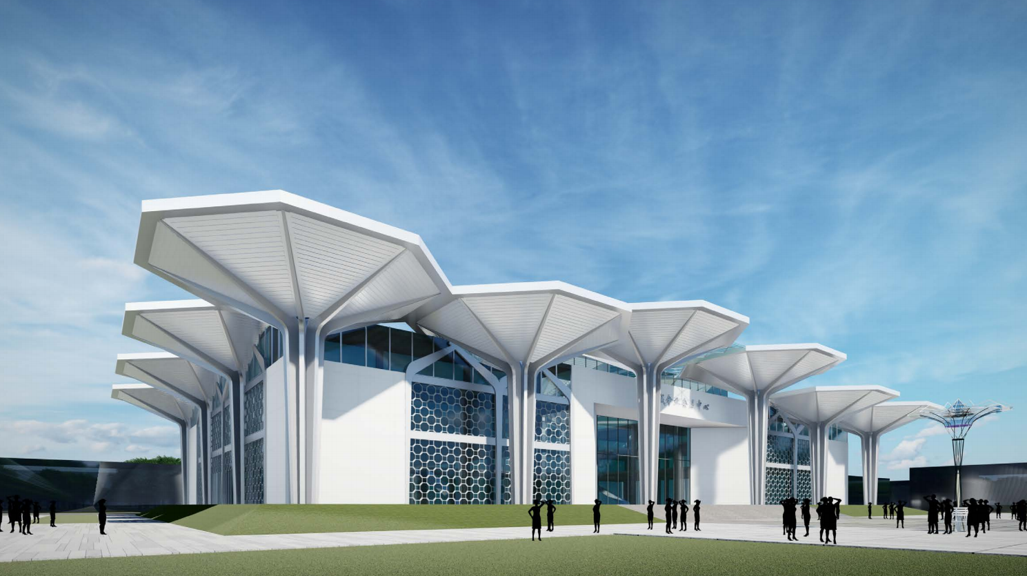 鄲城縣傘業(yè)產業(yè)園電子商務服務中心項目是鄲城縣傘業(yè)全產業(yè)鏈展銷的窗口項目、展示項目。會展中心的設計概念以“傘啟鄲興”為主題,基于對本土特色文化的深入解讀、同時結合“傘”的具體特征,提煉傘蓋、傘骨、傘柄的特殊形象為基本元素。建筑主立面以八個巨大傘形構架依次展開,巨型的尺度、新穎的造型有極強的昭示性,裝飾幕墻八邊形的單元分割也隱喻了傘蓋的造型,創(chuàng)新的視覺形象為傘業(yè)產業(yè)園增加了新的注解。會展中心整體的建筑風格充分展示了鄲城傘業(yè)產業(yè)園的核心價值,形成獨具特色的地標形象。