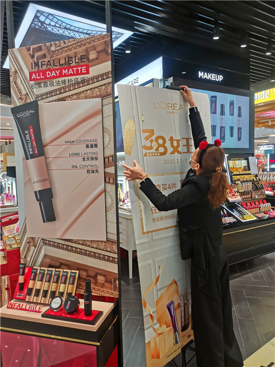 記者注意到,在各大商場女性品牌專柜,春季新款服飾、鞋帽占據(jù)醒目位置,為了贏得女性消費者的芳心,商家推出了打折、積分等活動。