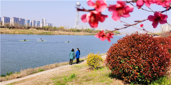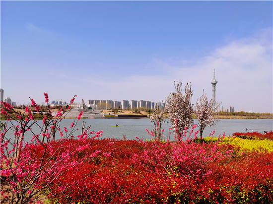 近日,在春花和藍天碧水映襯下,沙潁河兩岸桃花、海棠、石楠、櫻桃花競相綻放,沙潁河兩岸美如畫。