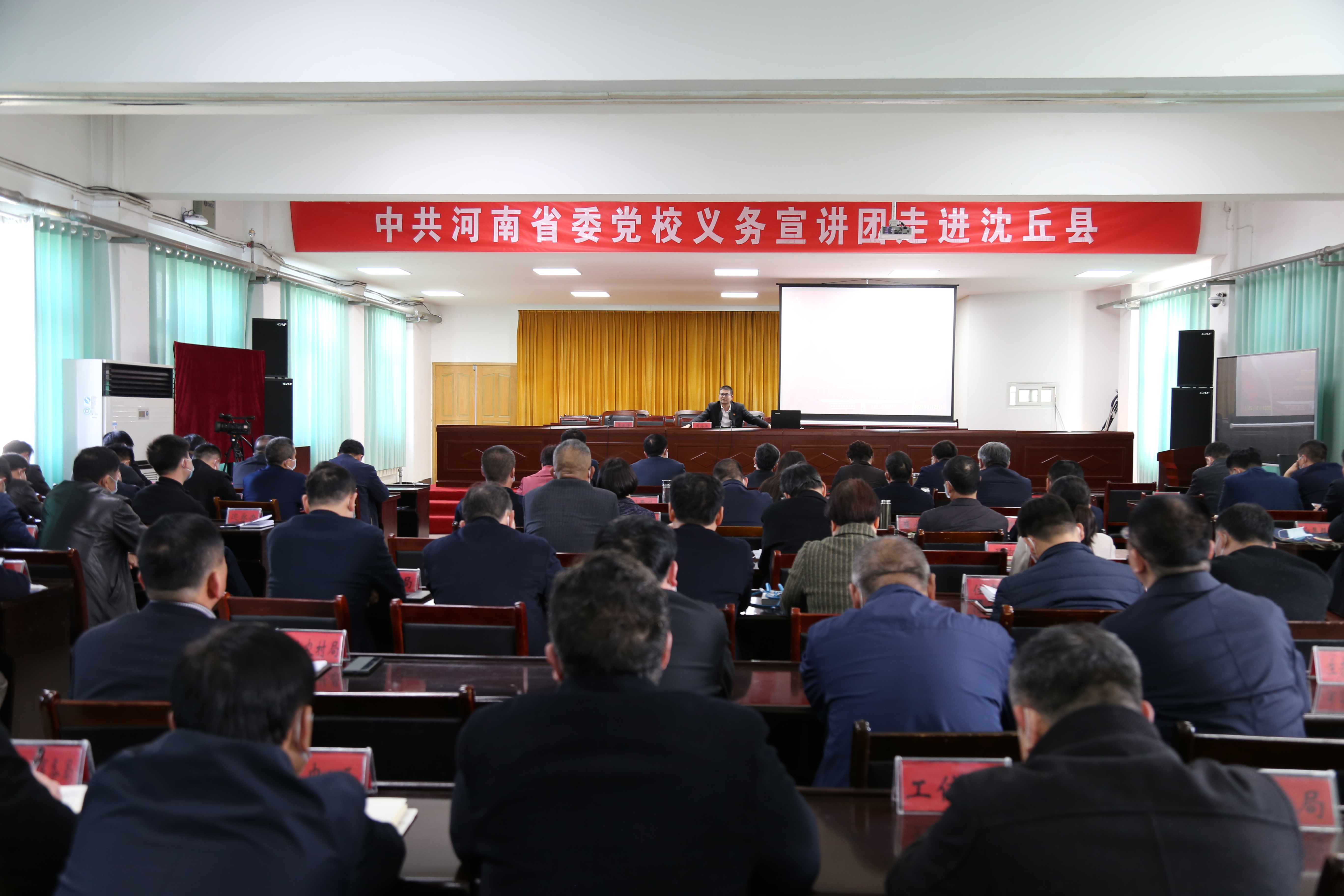 3月25日下午,中共河南省委黨校義務(wù)宣講團(tuán)走進(jìn)沈丘縣開(kāi)展宣講活動(dòng)?;矢α⑿?、賈慶偉、殷曉春、趙振、郝四春、劉和輝、呂孝坤等在家的縣四個(gè)班子領(lǐng)導(dǎo)及副處級(jí)以上干部與全縣近200余名黨員干部共同聆聽(tīng)了宣講報(bào)告。縣委副書(shū)記賈慶偉主持報(bào)告會(huì)。