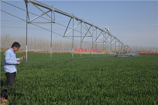 3月28日,商水縣天華合作社社員在察看投資200多萬元購進的自走式節(jié)水灌溉設備澆地效果。