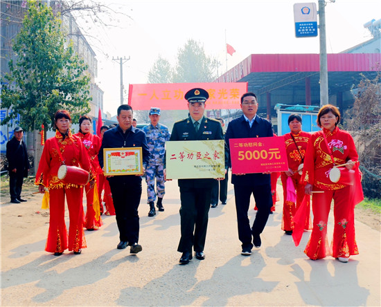 “來(lái)啦,來(lái)啦!”在鏗鏘激越的鑼鼓聲中,鹿邑縣人武部政委李峰、退役軍人事務(wù)局有關(guān)領(lǐng)導(dǎo)和賈灘鎮(zhèn)黨委、政府負(fù)責(zé)人一行人高舉“一人立功、全家光榮”的條幅闊步前來(lái),共同將二等功臣馮秋月的立功喜報(bào)和“二等功臣之家”牌匾、獎(jiǎng)金、慰問(wèn)品送到了她父母手中。村民紛紛趕來(lái)涌進(jìn)軍屬的庭院,為功臣馮秋月點(diǎn)贊,向她的家人鼓掌祝賀。