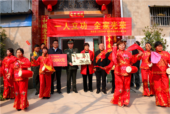 李峰說(shuō):“一張立功喜報(bào),不僅是軍人榮譽(yù)的象征、成長(zhǎng)進(jìn)步的見證,也承載著軍人家屬的期盼與慰藉。功臣是實(shí)現(xiàn)強(qiáng)軍興軍目標(biāo)的尖兵,他們?cè)诓筷?duì)建功立業(yè),我們力所能及服務(wù)保障好他們的家人,積極在全社會(huì)營(yíng)造起‘功臣受愛戴、軍人受尊崇、軍屬受尊敬’的氛圍?!睘榇?,鹿邑縣人武部積極構(gòu)建軍人軍屬榮譽(yù)體系,每逢重大節(jié)日,都要協(xié)調(diào)地方黨委、政府開展為現(xiàn)役軍人和軍屬送喜報(bào),掛功臣匾、光榮牌等活動(dòng),通過(guò)活動(dòng)激勵(lì)等形式,讓軍人軍屬享有更多的“專屬榮光”,努力營(yíng)造“一人參軍,全家光榮;一人立功,全村光榮”的濃厚氛圍,更加堅(jiān)定了軍屬支持子女獻(xiàn)身國(guó)防的決心,進(jìn)一步激發(fā)了鹿邑籍官兵獻(xiàn)身軍營(yíng)、報(bào)效祖國(guó)的積極性。②9
