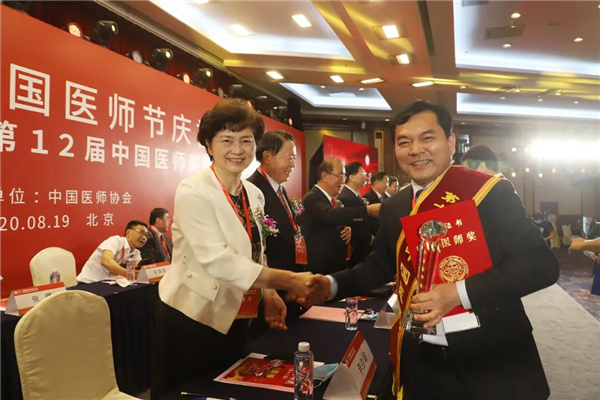 圖為:2020年8月在第十二屆中國(guó)醫(yī)師獎(jiǎng)?lì)C獎(jiǎng)典禮上接受李蘭娟院士頒獎(jiǎng)