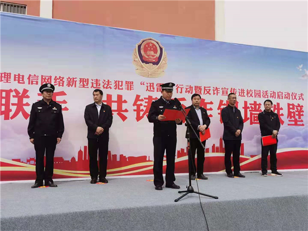 4月18日上午,鄲城縣打擊治理電信網(wǎng)絡(luò)新型違法犯罪“迅雷”行動暨反詐宣傳進(jìn)校園活動儀式在縣三高啟動??h政府副縣長、公安局長陳鳳祥,縣政府辦公室主任賈培民,縣教體局黨組書記、局長羅明黨等出席啟動儀式,縣打擊治理電信網(wǎng)絡(luò)新型違法犯罪工作各成員單位、縣公安局、縣三高分別組成代表隊(duì)2200余人參加啟動儀式,儀式由賈培民主持。