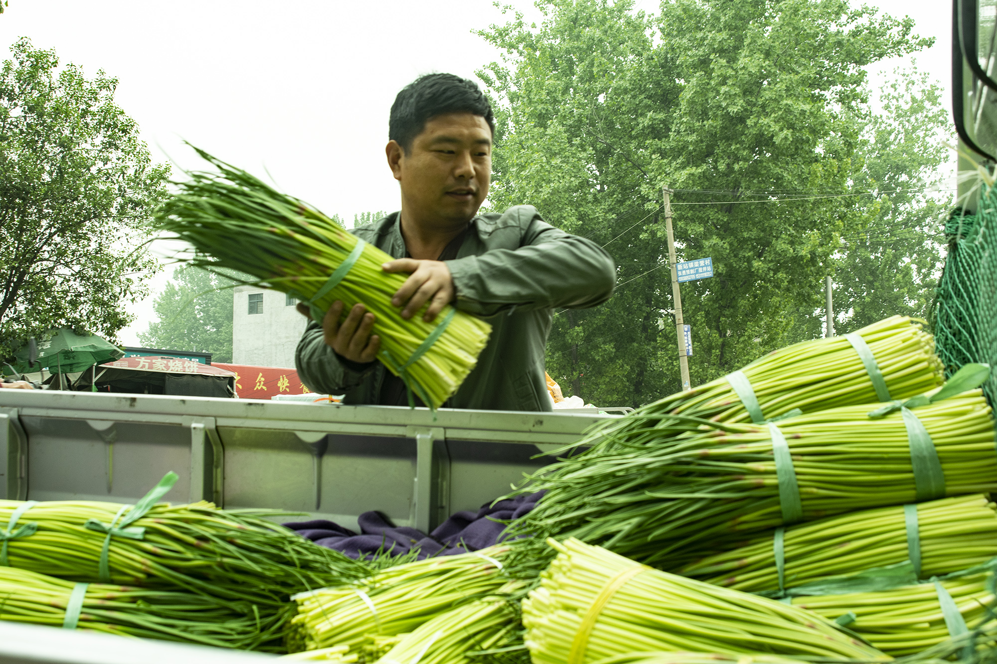 姚路口村一對老夫婦在自己蒜地里提取晚蒜薹